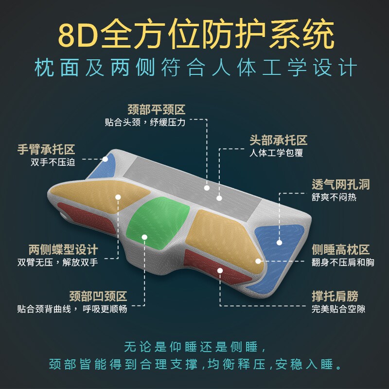 2.人体工学设计支撑颈椎,保持其不弯曲,即使睡姿变换,也能享受完美的支撑。