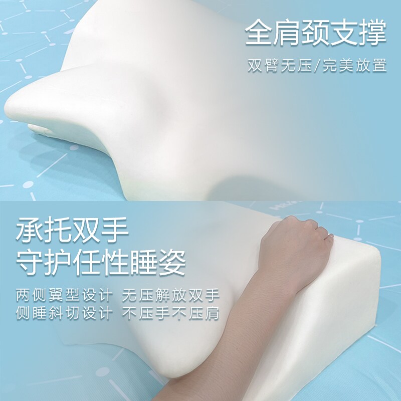 3.枕头两侧高度与肩部弧度相符,不会压迫肩膀或倾斜头部。即使侧睡,双手也不会受到挤压。